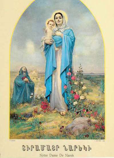 La devoción nace en el siglo X, en el Monasterio de Narek, ubicado en la región de Artashat, Armenia. Aquí vivió San Gregorio de Narek (951-1010), monje, poeta y teólogo, cuyo profundo misticismo y talento literario dejaron un legado espiritual invaluable para la Iglesia. Cuenta la tradición que San Gregorio, en un estado de contemplación, vio a la Virgen María con el Niño Jesús en brazos, y escuchó su llamada amorosa: “Gregorio, ven al Señor”. Este encuentro celestial, relatado con profunda emoción en sus escritos, se considera una aparición que fortaleció su fe y su obra, especialmente su famoso “Libro de Oraciones” o “Narek”. La Virgen de Narek por tanto encarna la unión perfecta entre María y la espiritualidad armenia, siendo para los fieles un refugio y guía en el camino cristiano.